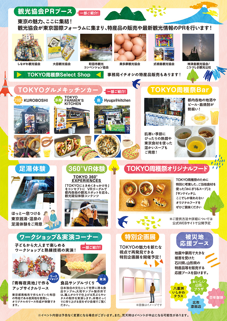 東京都の特産品販売やVR動画体験、足湯体験、ワークショップや、キッチンカーも集まります。今年はさらに内容を充実して東京観光等の魅力を楽しく知ることができる「特別企画展」や、職⼈の技を間近で体感できる「実演コーナー」が初登場となります。