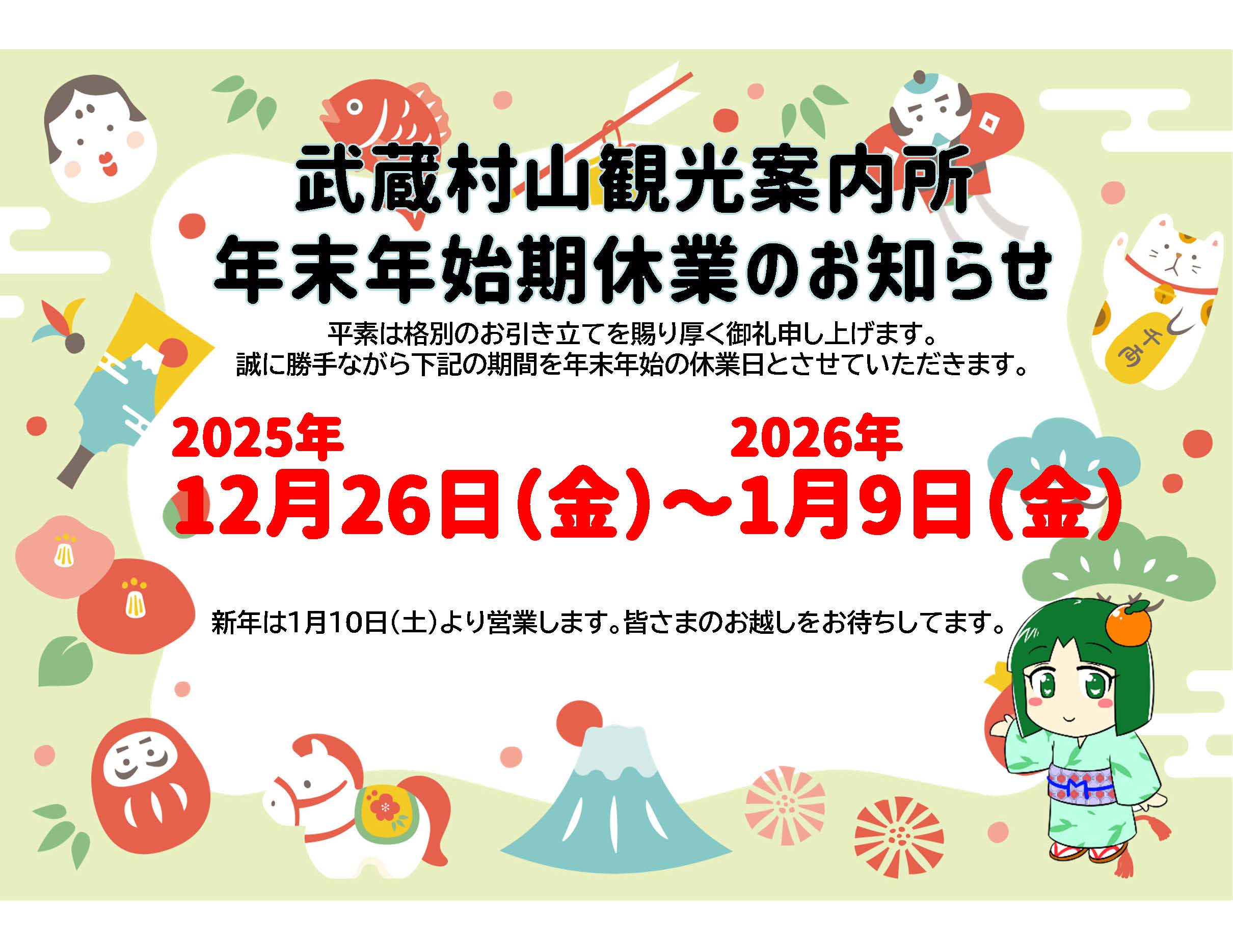 2025年-2026年の年末年始休業日は下記の通りとさせていただきます。ご迷惑をおかけいたしますがご了承のほどよろしくお願いいたします。