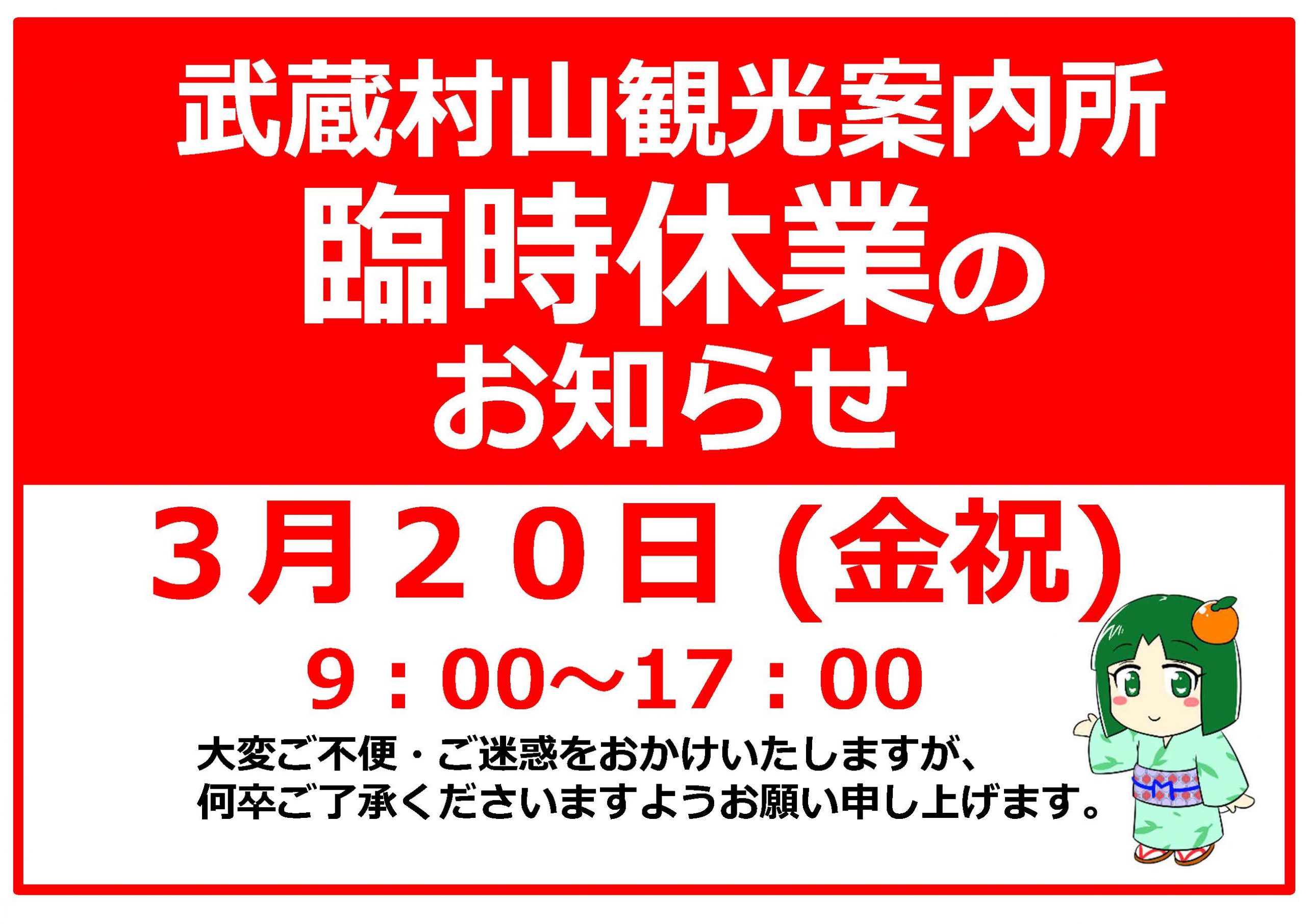 2026年3月20日(金祝)武蔵村山観光案内所は臨時休業とさせていただきます。ご迷惑をおかけいたしますがご了承のほどよろしくお願いいたします。